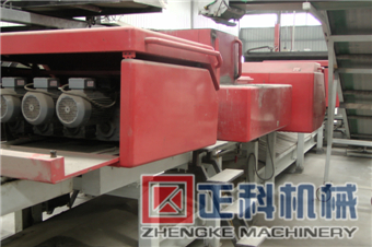 CYQB-Ⅰ型工业灰渣混凝土空心隔墙条板自动化生产线设计能力为年产50万㎡墙板,设备主机固定,墙板成型时物料受挤压和振动同时作用,边模、芯模连续挤压振捣成型、连续自动脱模,保障墙板具有良好的密实性和外形尺寸,成型后采用钢托板托护稳定进行初凝养护。板坯移动方便,场地使用灵活、利用效率高。传动装置带动托板移动流转,成型工段推料挤压螺旋变频调速,由中央控制器调整控制灰渣板成型的密实程度,实现灰渣板的连续自动流水线生产。由于采用低水灰比的干硬性混合料挤压成型,可得到强度和密实度较高的空心墙板。水灰比0.3~0.4,坍落度为0,干缩率<0.03%,避免产生目前国内轻质隔墙板生产应用中普遍存在的收缩裂缝问题。自动化连续生产,效率高、质量一致性高、保障了墙板品质。